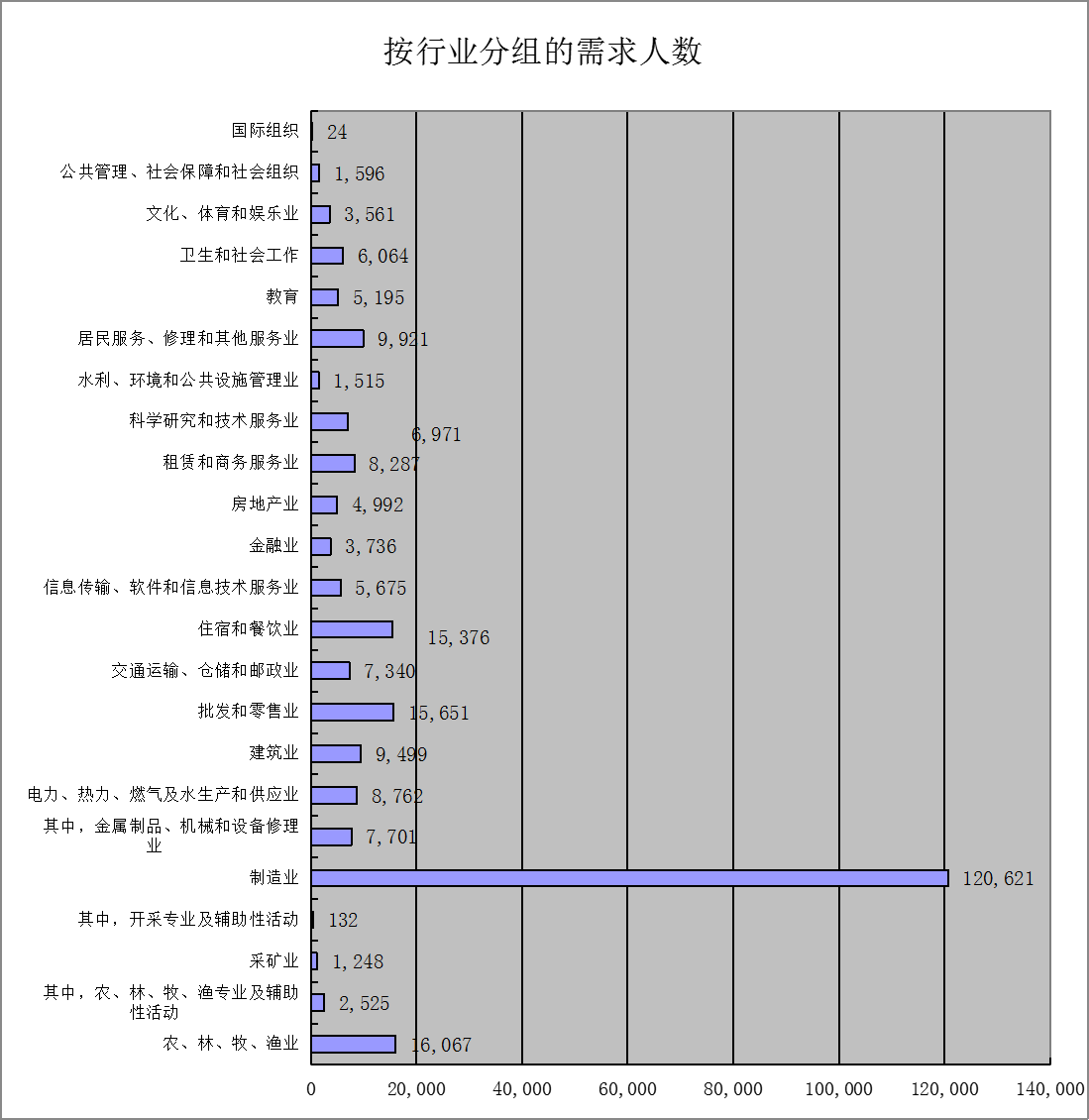 从行业需求来看:“制造业”“农、林、牧、渔业”“批发和零售业”占据着各行业中用工量的前三位。占比依次为47.85%、6.37%、6.21%。
