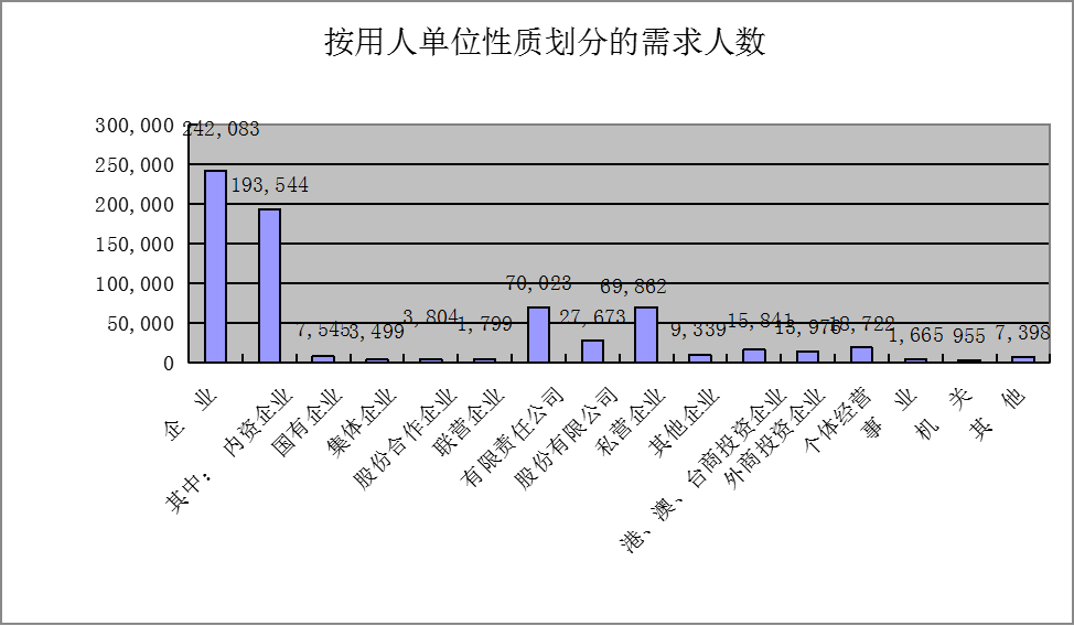 从用人单位性质来看:内资企业需求总量为19.35万人次,所占比重达到企业需求总量的79.95%;内资企业中的“有限责任公司”、“私营公司”、“股份有限公司”为用工需求量前三位的用人单位,用工需求量分别占企业需求总量的28.93%、28.86%、11.43%。
