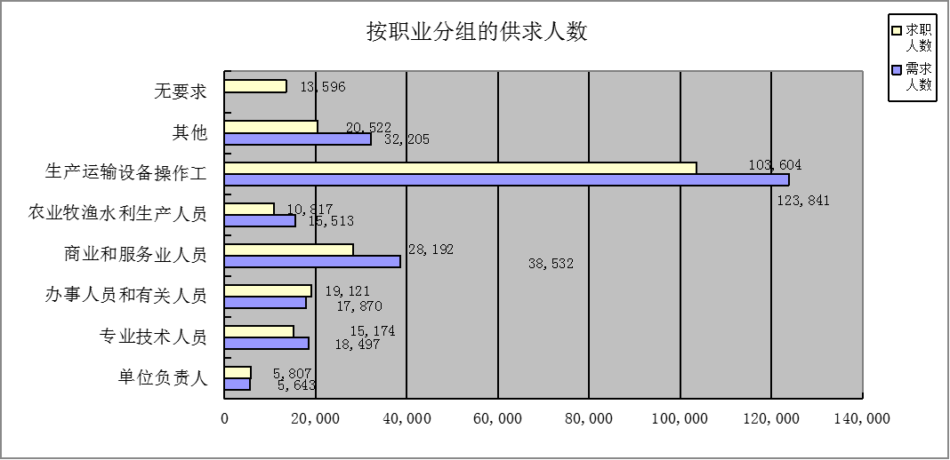 本季度职业供求总量为46.89万人次,同比下降4.33%,环比上升0.98%。其中:岗位需求登记25.21万人次,同比下降5.5%,环比上升1.14%;求职登记21.68万人次,同比下降2.93%,环比上升0.79%。