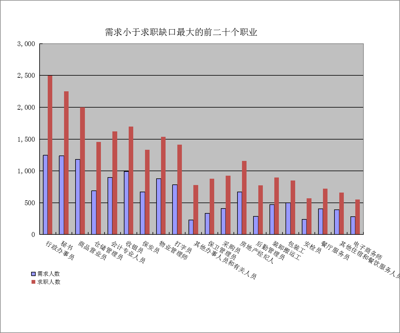 一是求大于供岗位(工种):“其他生产制造及有关人员”、“营销员”、“快递员”企业需求缺口分别是3739人次、1881人次、1839人次。二是供大于求岗位(工种):“行政办事员”、“秘书”、“商品营业员”的市场登记缺口分别是-1253人次、-1013人次、-818人次。