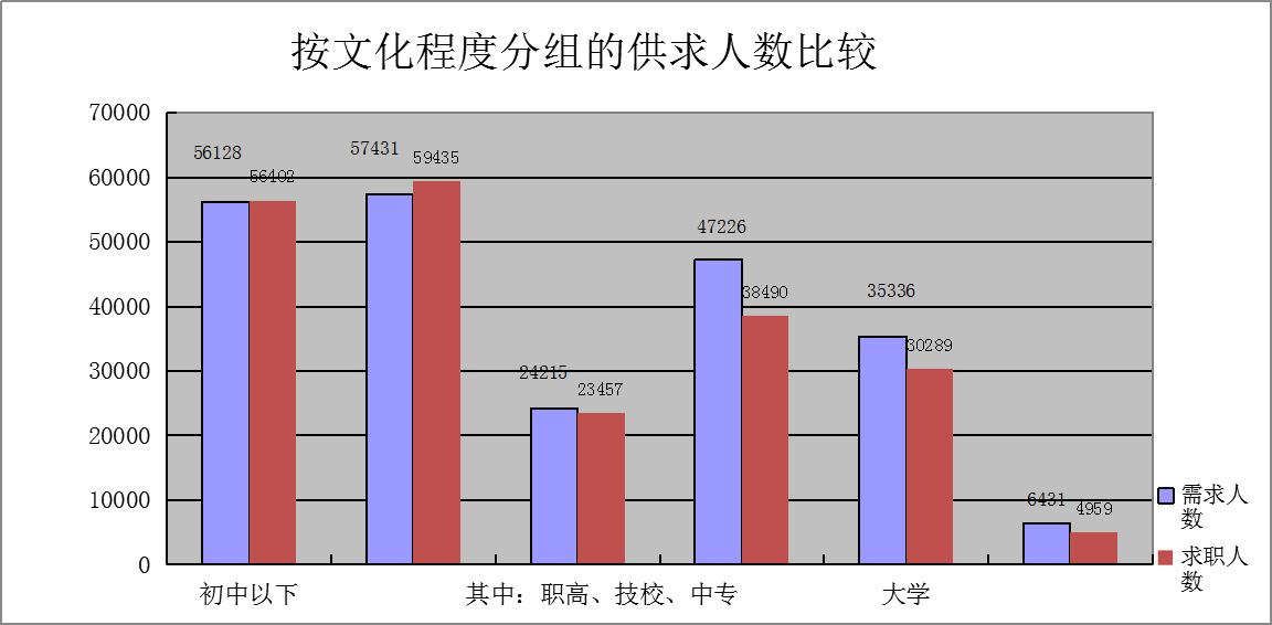 从文化程度上看,高中和初中以下学历的求职人员占求职总数的61.1%,整个人力资源供给市场学历仍相对较低,人力资源供给的素质结构需要进一步提升。